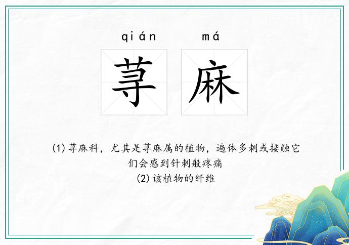 ⒈ 多年生草本植物。叶对生,卵形,开穗状小花,雌雄同株。茎叶皆有细毛,皮肤接触时能引起刺痛。茎皮纤维可作纺织原料。叶可入药,治蛇毒等症。
