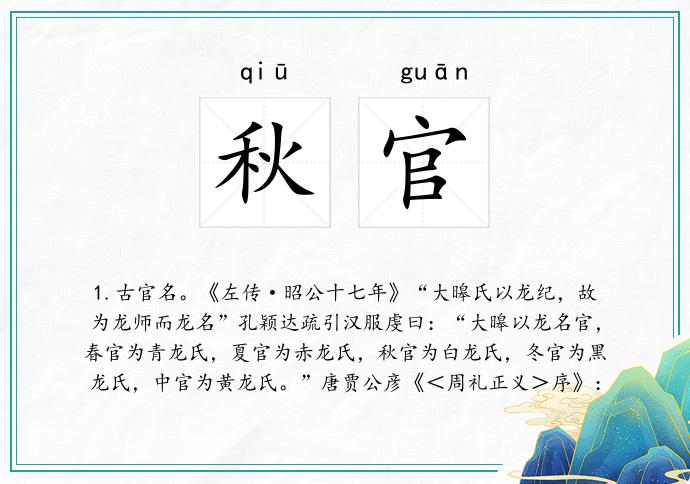 所司与后代刑部相当,故唐武则天曾一度改刑部为秋官。后世常以秋官为掌司刑法官员的通称。 唐杨炯《遂州长江县孔子庙堂碑》:“掌山林於夏典,物得其生;听狱讼於秋官,人忘其死。”
