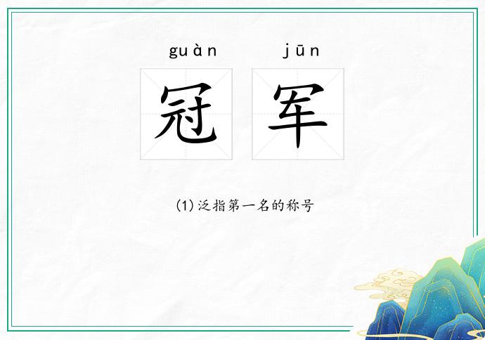 ⒉ 泛称得第一者。常指体育运动等竞赛中的第一名。
