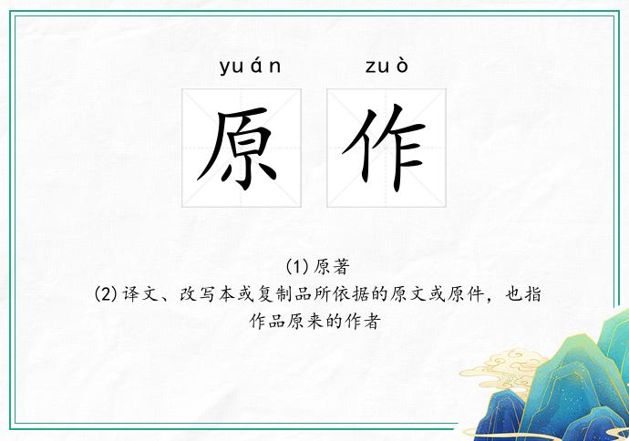 (2) 译文、改写本或复制品所依据的原文或原件,也【好查hao86.com】指作品原来的作者