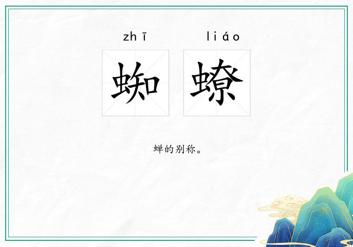 引《说郛》卷八七引宋陆泳《吴下田家志》:“蜘蟟蝉叫稻生芒。”明郎瑛《七修类稿·天地三·气候集解》:“蜩,蝉之大而黑色者,蜣螂脱壳而成,雄也能鸣,雌者无声,今俗称蜘蟟是也。”