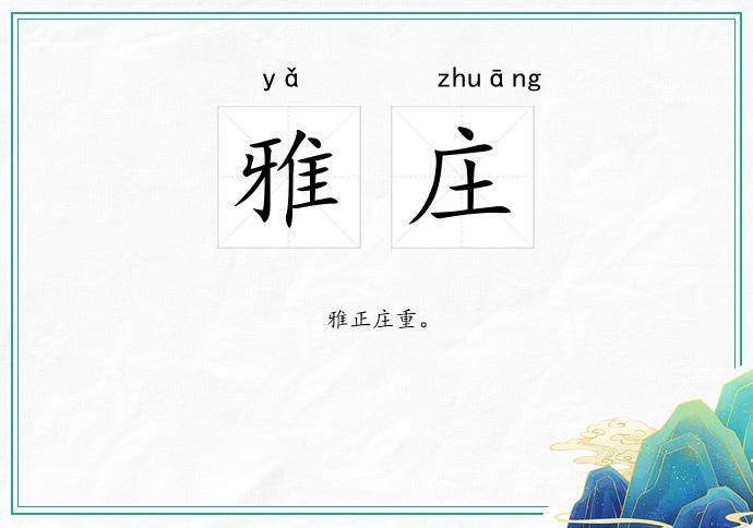 1. 正规的,标准的:雅言。雅正(a.规范的;b.正直;c.客气话,用于赠给他人的书画题款上,请对方指正)。