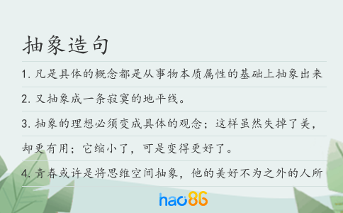 好查造句频道为您提供2025年的抽象造句相关内容,造句频道小编原创了280条的抽象造句内容,频道内容适合一二年级的小学生参考!!